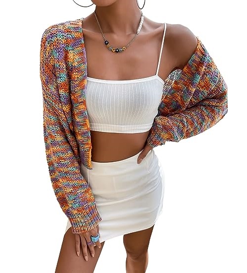 - Features: Open front, long sleeve, colorful space dye, drop shoulder, cropped length.